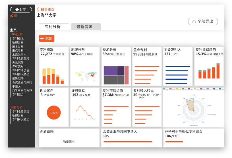 为企业、科研院所,定制相关数据展示大屏,用最快捷、直观的形式给科研单位详细的专利、技术与行业情况分析,工作效率得到大幅提升